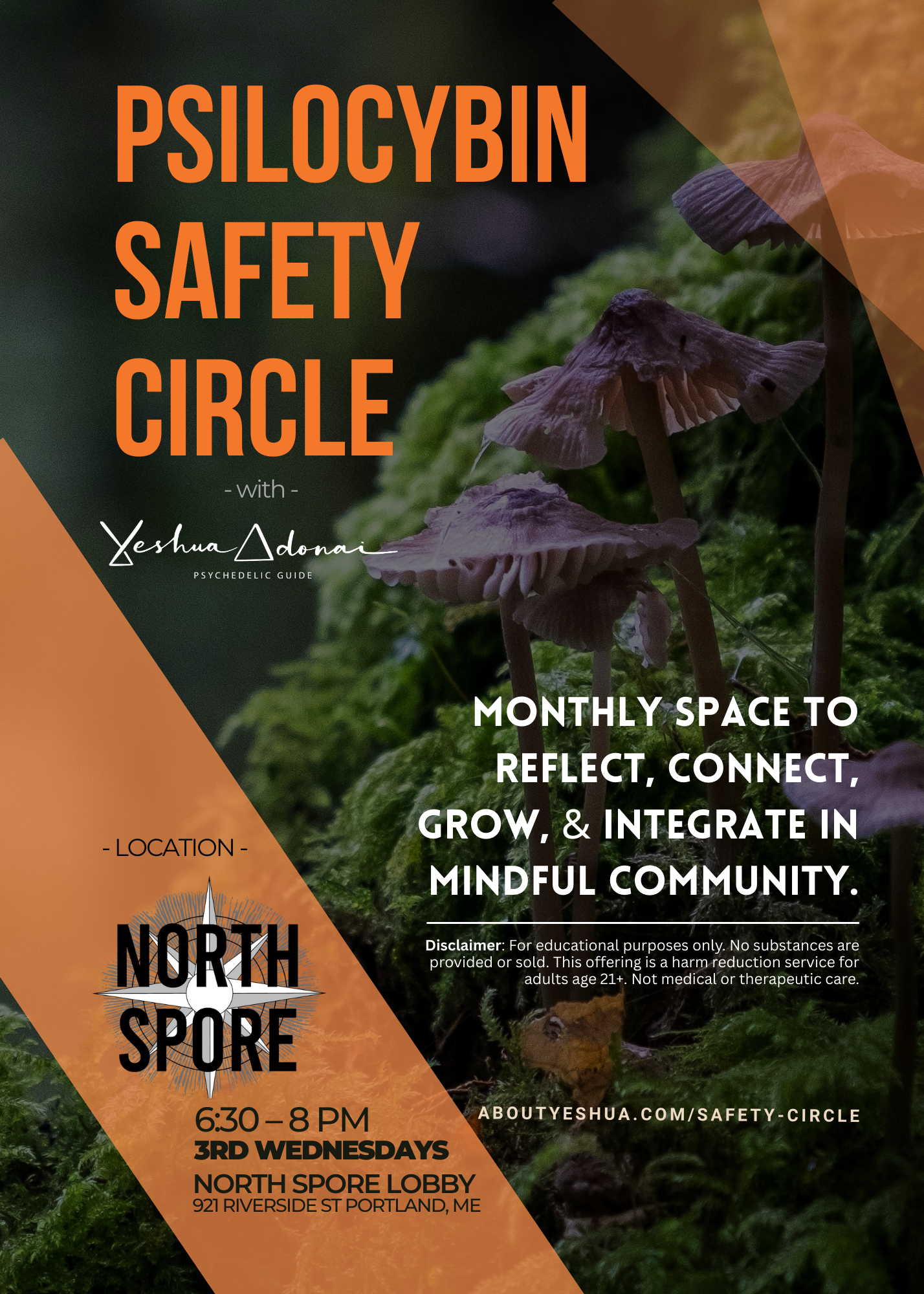 Join us every third Wednesday of the month from 6:30–8 PM at the North Spore Lobby (921 Riverside St, Portland, ME) for an evening of mindful education, conversation, and community.